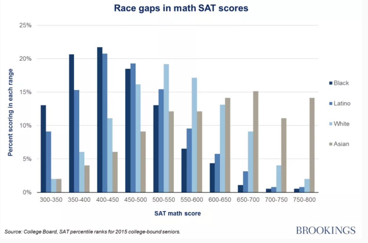 I don’t know of any similar recent analysis of this that has been done. So to estimate how much affirmative action is being done, we have to infer from more aggregate data. And this is done looking at SAT score distributions by race, and the racial composition of student bodies at universities. I limited by analysis to the top 20 universities by average SAT. All SAT data is math+verbal only.