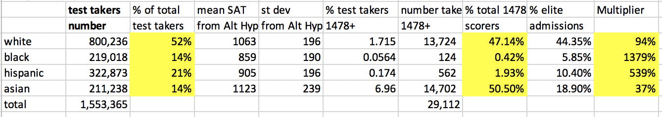 We can compare the proportions each racial group made of the 1478+ SAT scorers, and what percentage of admissions they were compared to their percentage of the 1478+ SAT scores: