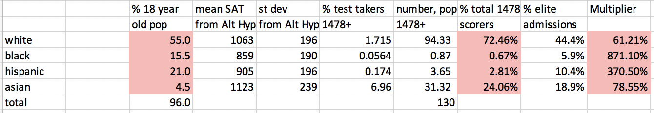 Whites should be 72.46%, blacks should be 0.67%, hispanics should be 2.81%, and asians should be 24.06%. The deviations from these result in whites only having 61.21% as many students in the top 20 universities as they should, and asians only getting 78.55% of their students in. Hispanics get 370.11% as many students as they should get, and blacks get a whopping 873.13%, almost nine times the representation that their SAT scores warrant.